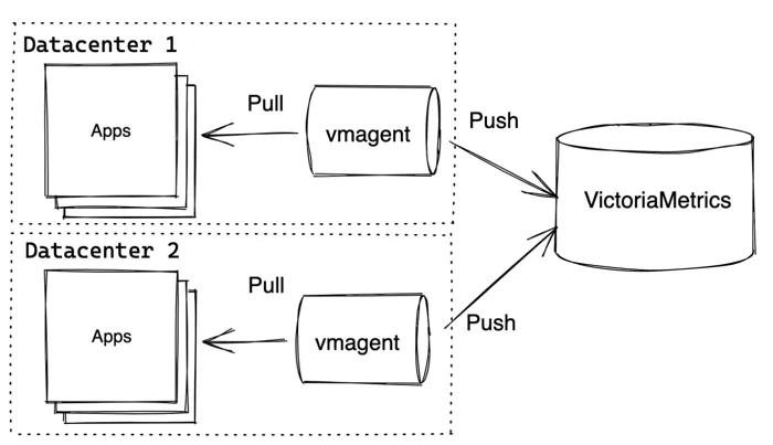 VictoriaMetrics 组件允许构建更高级的拓扑结构。例如,vmagent 可以从不同数据中心推送指标到集中的 VictoriaMetrics: